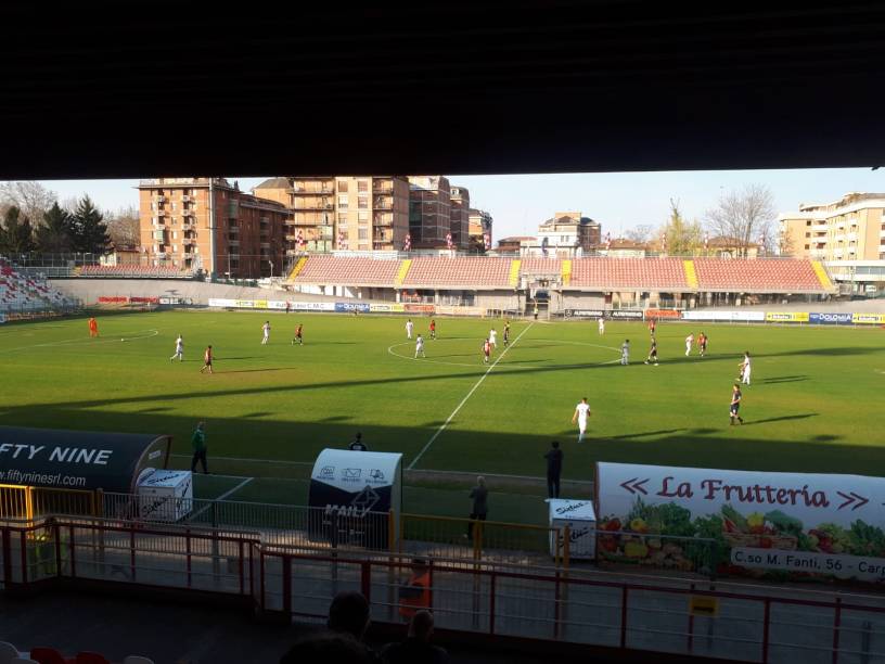 Schiera un tridente “pesante”, come promesso, mister Pochesci: tra i pali c’è Rossi, con Gozzi, Venturi e Varoli a comporre il terzetto arretrato; a centrocampo Eleuteri e Lomolino giocano larghi, Fofana e Ghion al centro, con Giovannini trequartista alle spalle di De Cenco e De Sena. Pronti, via e al 4’ il Carpi passa: sugli sviluppi di un calcio d’angolo, il pallone arriva sul secondo palo a De Cenco, che insacca alle spalle di Giacomel. La risposta ospite si fa attendere, si vedono ancora i padroni di casa con Ghion, che calcia alto non di molto. Al 12’ pericolosa la Virtus Verona, con Danieli che prova una conclusione dalla distanza, ma trova la risposta dell’ottimo Rossi, che toglie la sfera dall’angolino e devia in corner. Minuto 26, ancora bravo Rossi ad opporsi alla conclusione di Pittarello, tuffandosi sulla sua sinistra e mandando la sfera in angolo. È il preludio al gol ospite: sugli sviluppi dell’angolo, proprio Pittarello approfitta di un buco della difesa biancorossa e con un colpo di testa preciso batte Rossi, che stavolta non può nulla. Non accade molto altro, la prima frazione si chiude dopo 2’ di recupero sul risultato di 1-1.