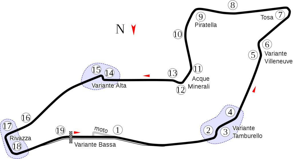 Il circuito si distende per 4,909 km da percorrere in senso antiorario e conta 19 curve: 10 a sinistra e 9 a destra. La larghezza ristretta dell’asfalto rende molto difficile il sorpasso: nell’ultima edizione, lo scorso anno, in pista sono avvenuti solo sei sorpassi; sarà dunque ancora più importante, per i piloti, centrare il giro perfetto in qualifica e posizionarsi davanti in griglia di partenza. I punti più favorevoli per il sorpasso sono il rettilineo di partenza in prossimità della frenata di curva 2, e la “Tosa”, nome dato al tornante di curva 7, dove si può azzardare una traiettoria più larga per uscire davanti all’avversario sul tratto che porta verso curva 8. Sarà fondamentale, per i piloti, farsi trovare pronti ed essere rapaci a sfruttare un minimo errore in trazione o in ingresso curva del pilota davanti. Il lavoro di meccanici e piloti per trovare il miglior setup per la gara sarà decisivo: sarà data molta importanza alla riduzione del carico aerodinamico per raggiungere una maggiore velocità di punta; allo stesso tempo, però, bisognerà cercare di ottenere una vettura stabile per affrontare al meglio le curve da percorrere a piena velocità sfruttando bene gran parte dei cordoli piatti e tricolori presenti sul tracciato. Con l’ausilio della foto, analizziamo ora un giro sul circuito romagnolo.