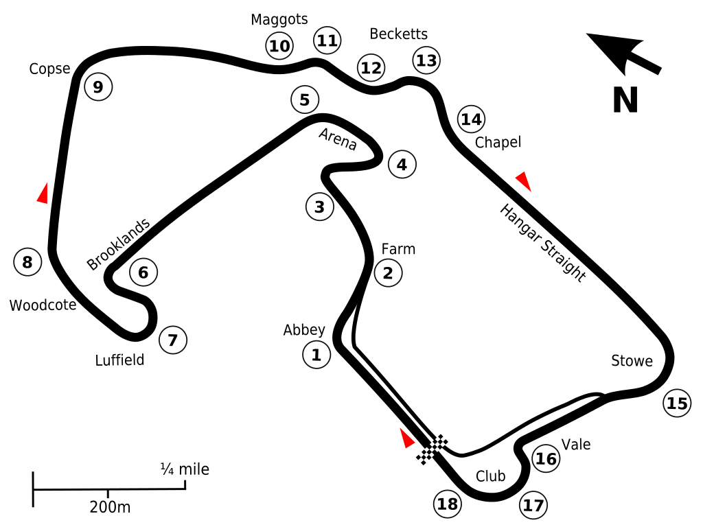 Le prime due curve sono da percorrere a piena velocità sfruttando bene il primo cordolo in ingresso di curva 1 e sfiorando solamente quello interno di curva 2. Curva 3 si prepara allargandosi bene per pizzicare il cordolo interno e per allargarsi bene sulla destra prima di curva 4, insidiosa quanto preziosa per il tempo sul giro; è opportuno qui sacrificare la velocità in ingresso per avere una trazione perfetta e andare prima sul gas, con la curva Aintree che immette sul Wellington Straight, ottimo punto per il sorpasso in staccata. In curva 6 si sfrutta molto il cordolo interno per ritrovarsi a centro pista prima del tornante Luffield, dove uscire forti e senza sovrasterzo può far guadagnare molti decimi sul giro. Da qui si percorre in pieno la famosa curva Copse, la quale immette nel celebre serpentino inglese costituito da Maggotts e Becketts, con la Chapel che immette sull’ Hangar Straight, altro punto favorevole per i sorpassi. In curva 16 si pizzicano leggermente i freni e si accompagna la vettura fin sopra il cordolo interno, stando attenti a non finire larghi sul cordolo esterno. Le ultime curve, strette e quasi a 90°, sono da percorrere in funzione dell’ultima, la Club, così da arrivare sul traguardo il più veloci possibile.