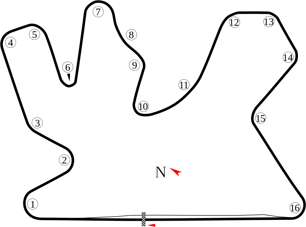 1068 metri di rettilineo iniziale, punto favorevole al sorpasso in scia della vettura davanti, preparano alla piccola parabolica di curva 1. Si frena ai 50 metri in trail braking, portando cioè la frenata fino all’apice, con il gas da pinzare subito dopo. In curva 2, così come per la maggior parte del tracciato, si sfruttano i cordoli interni ed esterni per ottenere una maggiore velocità e linearità. Si rallenta particolarmente per la doppia curva a destra (4 e 5) prima della lenta curva 6, zona in cui ci si concentra sulla trazione in uscita. Ancora trail braking alla 7, con la 8 e la 9 da percorrere in pieno o sollevando leggermente il piede dall’acceleratore. Alla 10 si pensa solo all’uscita di curva, con la trazione difficile da trovare data la lunga curva a sinistra che segue e la ghiaia posta a pochi metri sulla destra. Full gas alle curve 12 e 13 con il freno motore da sfruttare alla 14 per rallentare la vettura e non uscire fuori pista. Anche alla 15 si pinzano leggermente i freni e ci si lancia all’ultima, la 16, con la frenata che parte dopo i 50 metri e con il gas da attivare appena si intravede il rettilineo.