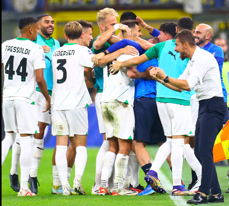 Per provare a bissare l’ottima prestazione valsa i tre punti contro la Juventus nell’ultimo turno, Dionisi conferma la formazione capace di imporsi sui bianconeri, con sole due eccezioni: in porta, Consigli si riprende il posto da titolare a discapito di Cragno, mentre in difesa è Viti ad affiancare Erlic al centro della retroguardia. Per il resto, la formazione è la stessa: conferme per i terzini Toljan e Vina, davanti alla difesa giocano ancora Boloca ed Henrique e davanti Berardi, Bajrami e Laurientè sostengono l’unica punta Pinamonti. L’Inter risponde con un 3-5-2 in cui la coppia offensiva è composta da Lautaro e Thuram; in panchina l’ex Frattesi.